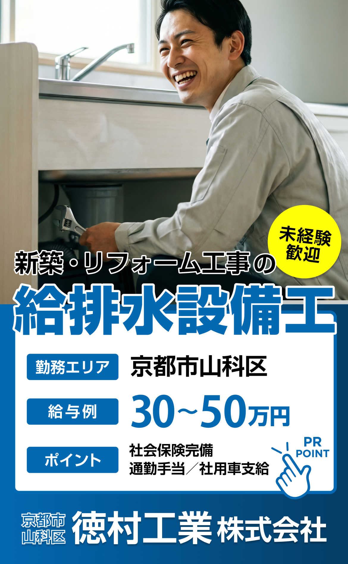 徳村工業株式会社は、京都市山科区を中心に、新築やリフォームの水回り工事、排水管の交換や不具合対応、水漏れ・詰まりなどのトラブル対応まで、地域の暮らしを支える設備工事を行っています。
