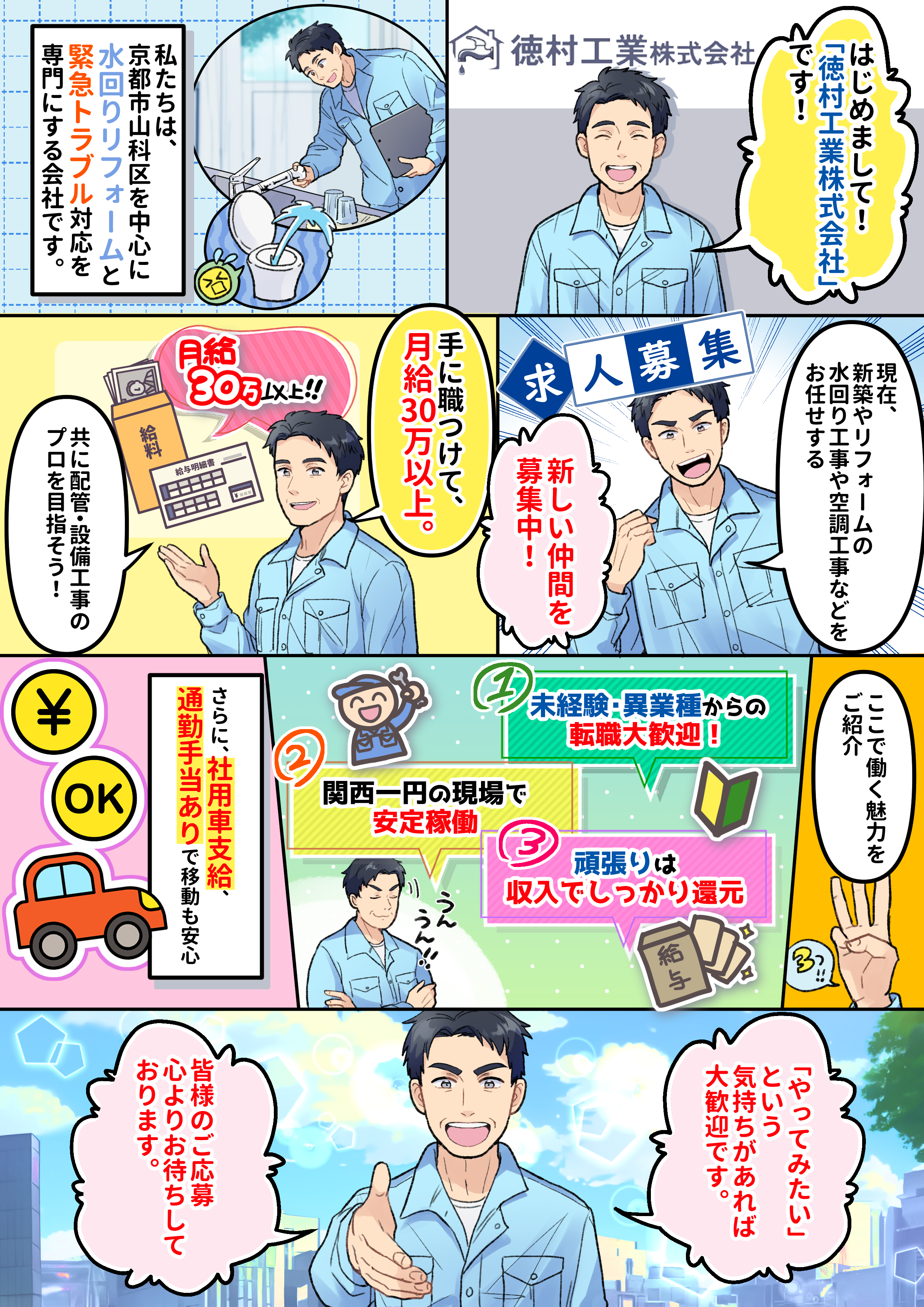 徳村工業株式会社は、京都市山科区を中心に、新築やリフォームの水回り工事、排水管の交換や不具合対応、水漏れ・詰まりなどのトラブル対応まで、地域の暮らしを支える設備工事を行っています。